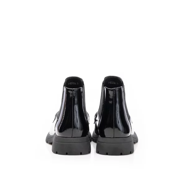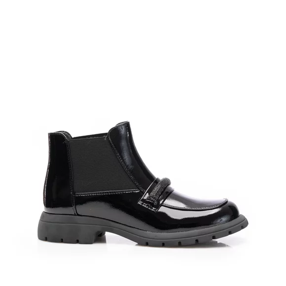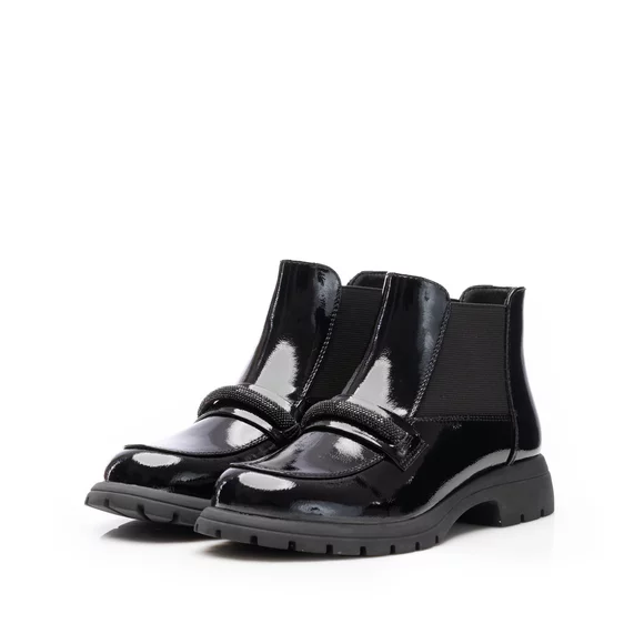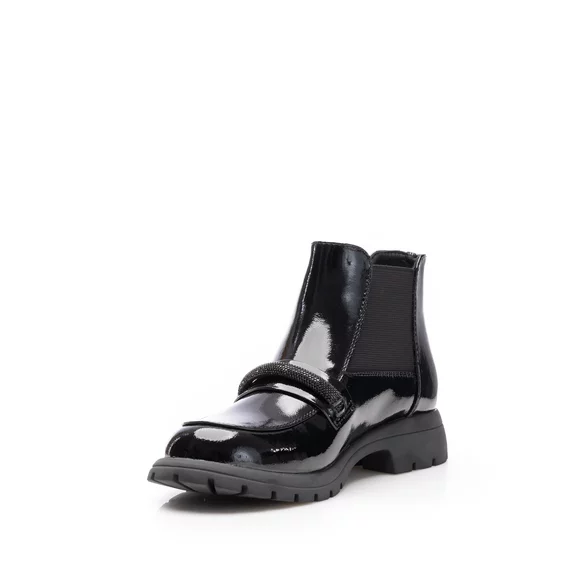 - Botine damă din piele naturală lac. Au vârful rotunjit cu o talpă foarte ușoară, ghetele prezintă elastic pe părțile laterale iar în față un accesoriu decorativ tip baretă.