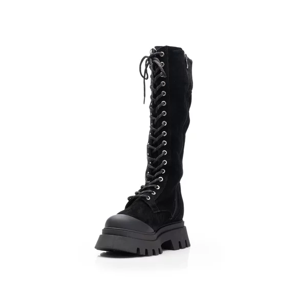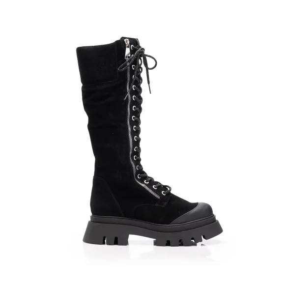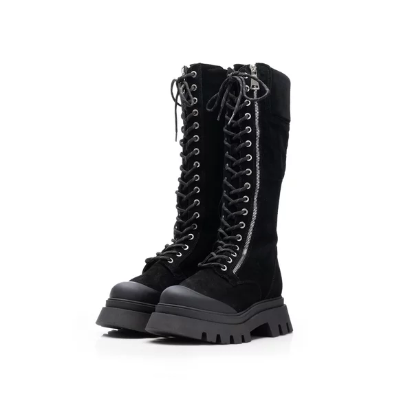 - Cizme damă cu șiret din piele naturală velur cu talpă groasă. Prezintă fermoar decorativ pe partea exterioară iar pe partea interioară are fermoar funcțional. Acest model se potrivește oricărui tip de picior întrucât circumferința cizmei este reglabilă din șiret.