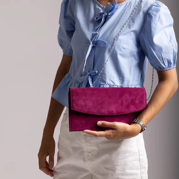 - Geantă plic slim, elegantă pentru damă din piele naturală velur, cu o barete tip lanț de 118 cm lungime. Este o geantă cu ținută care se poate asorta ușor unei vestimentații elegante.