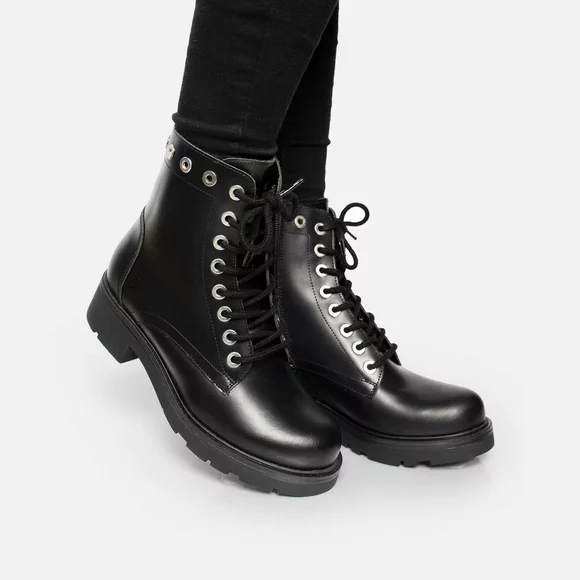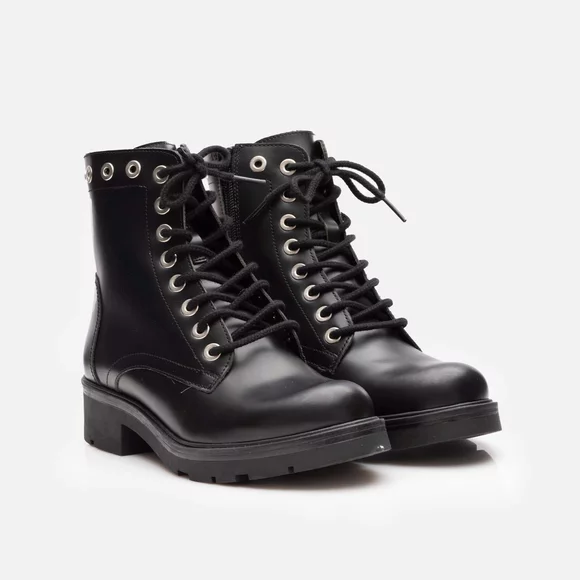 - Ghete damă din piele naturală box cu capse decorative. Interiorul este captușit cu material textil mai grosuț, este un model actual foarte ușor de asortat cu o ținută casual