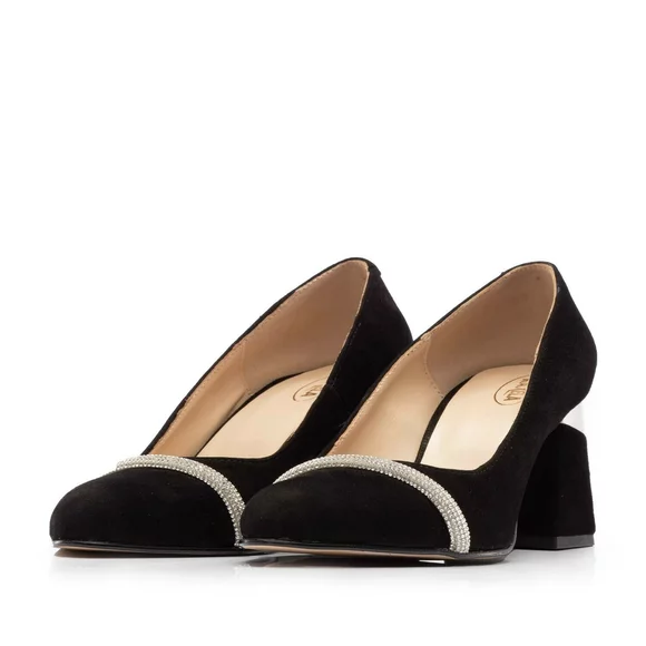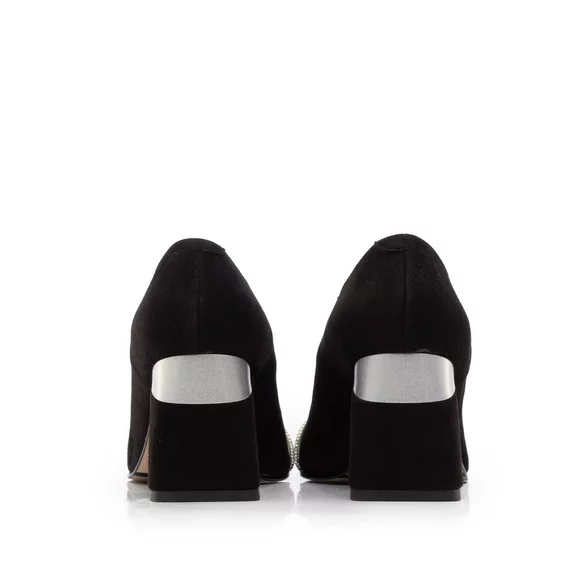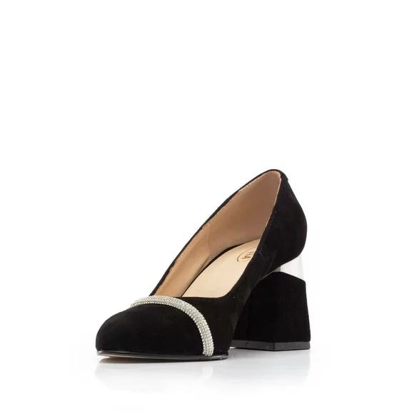 - Pantofi eleganți damă din piele naturală velur cu vârful ușor ascuțit. Pantofii au tocul trapez, îmbrăcat, fiind foarte comozi și ușor de asortat unei ținute elegante sau office.