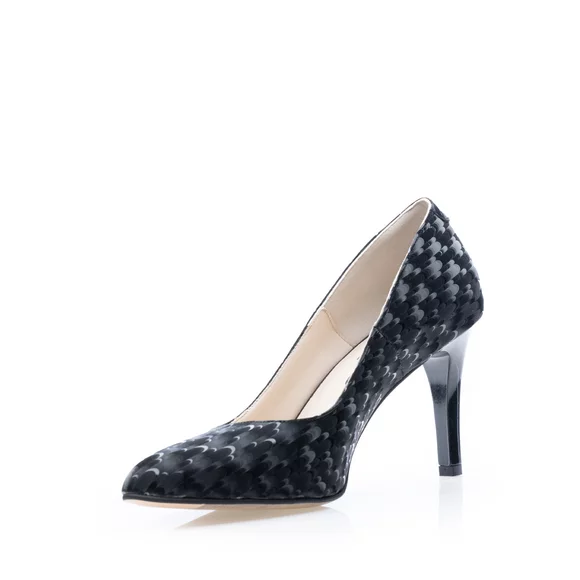- Pantofi eleganți dama din piele naturală velur cu imprimeu 3D cu vârful ascuțit. Pantofii au un toc stabil de 8.5 cm, talonetul în partea din față este cu Memory foam fiind foarte comozi. Sunt ușor de asortat unei ținute elegante,office sau casual.