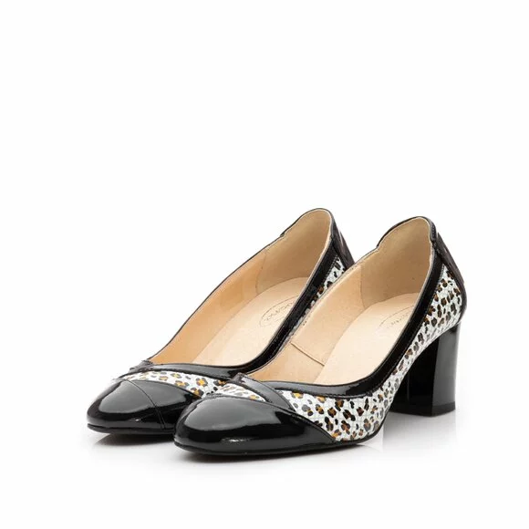 - Pantofi eleganți damă din piele naturală box cu vârful ușor ascuțit. Pantofii au un toc mediu fiind foarte comozi și ușor de asortat unei ținute elegante, office sau casual.